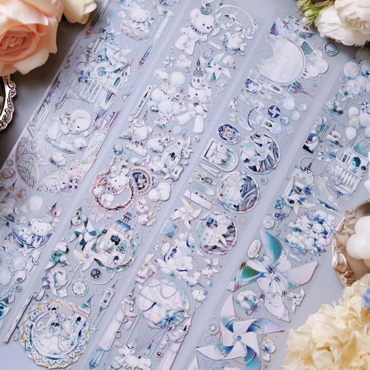 The Bear’s Journey PET Tape by Shine Studio captures a dreamlike adventure through the clouds - where soft bears drift past castles, balloons, and moonlit skies. With delicate hand-drawn details and iridescent holographic highlights, each scene feels like a page from a fairytale, filled with charm and imagination.